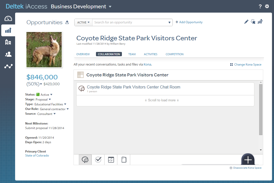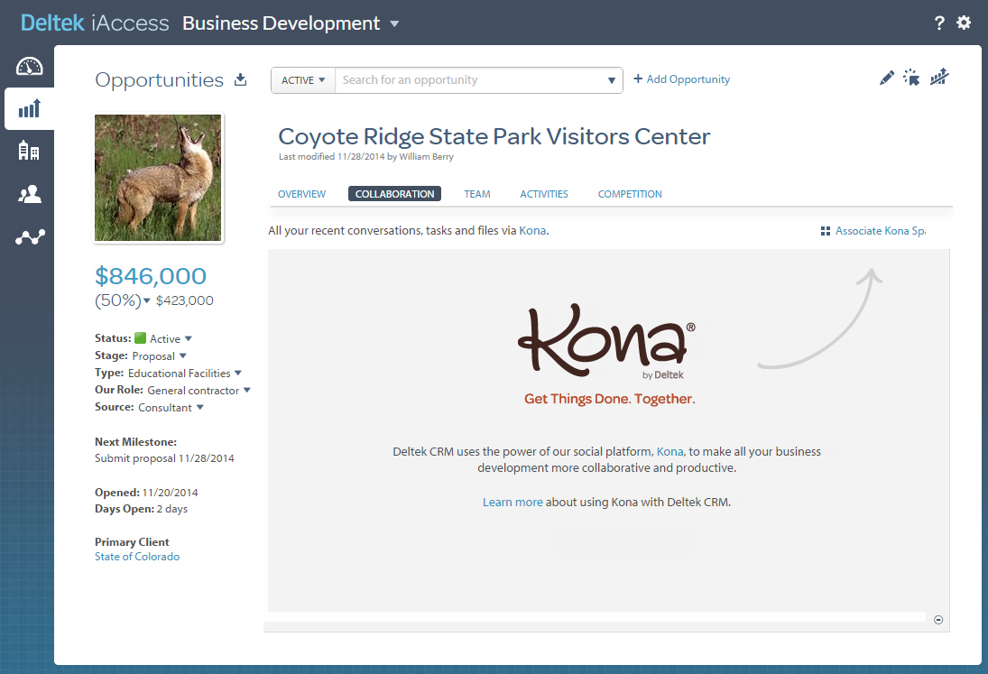 Use the Collaboration tab in the Opportunities area to associate opportunities with spaces in Kona Business and to access those spaces from within