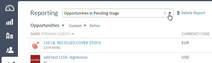To select a report that you have saved, do any of the following in the saved reports search field next to the Reporting area title: